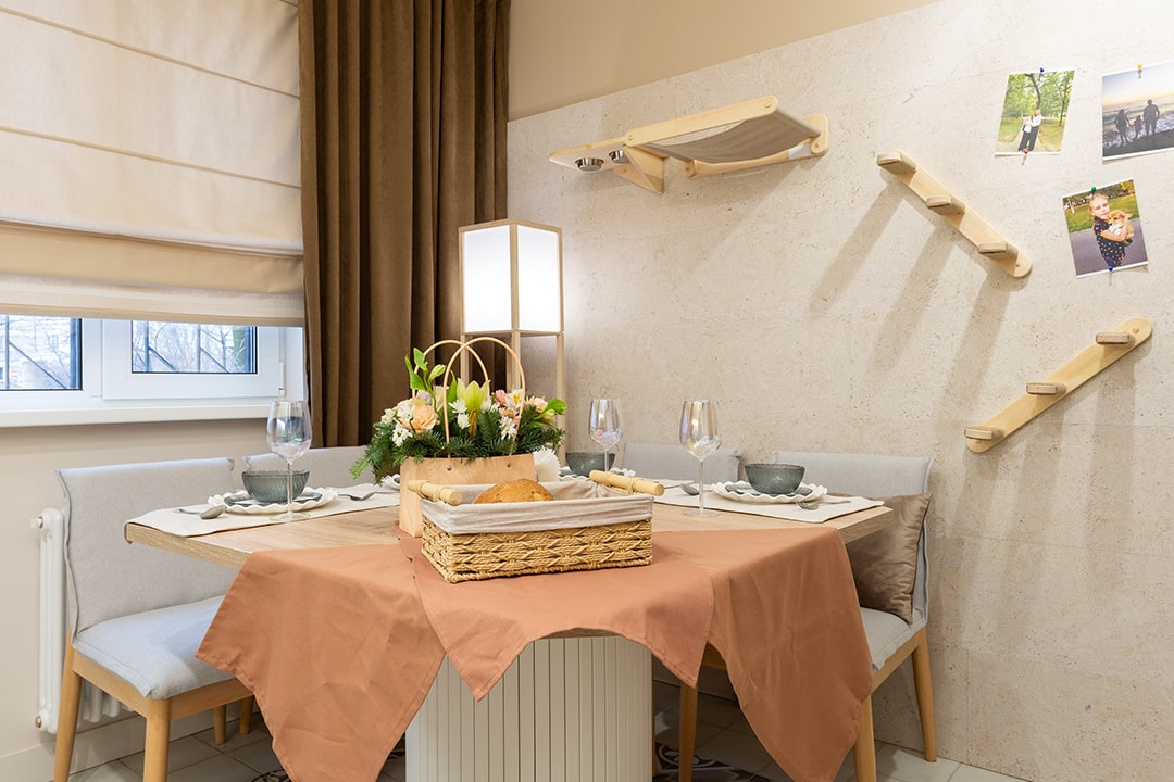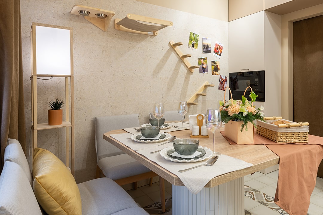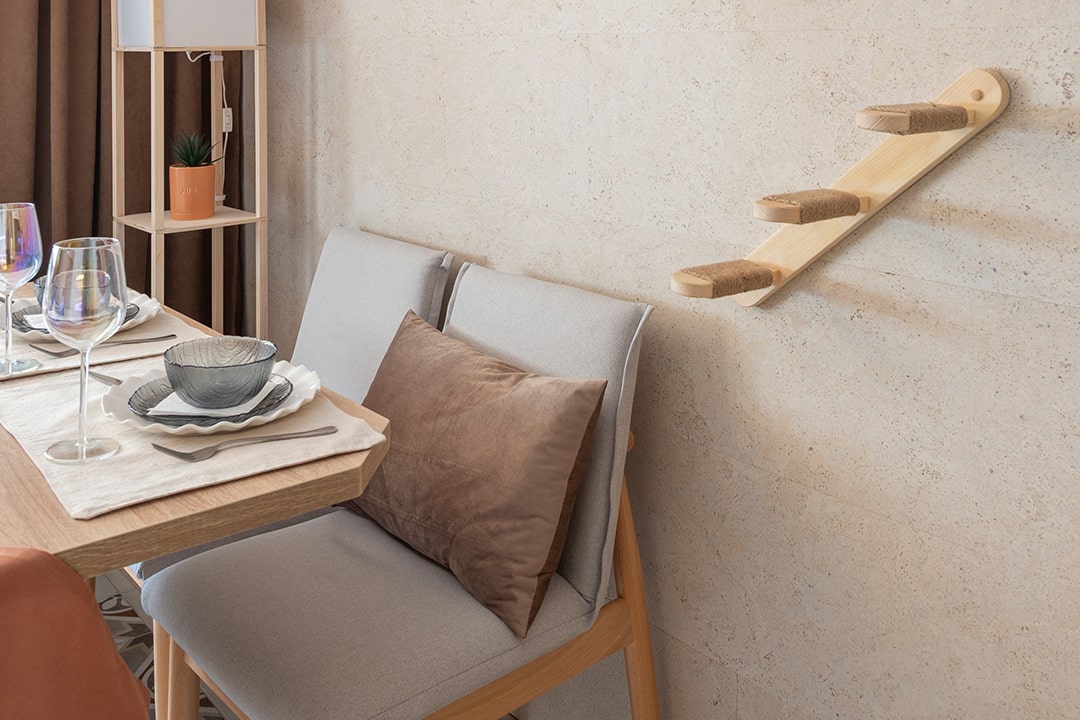 В обновленный интерьер кухни — места теплых посиделок, дизайнер внесла нескучный элемент. Пробковый замковый пол был уложен на стену, таким образом послужил защитной стен от кухонной мебели, а также идеально вписался в цветовую гамму. Пробковый пол из коллекции EcoCork производится из натуральной коры пробкового дуба, которая состоит из ячеек, наполненных воздухом, благодаря чему, покрытие обладает уникальными свойствами и преимуществами: высокая шумоизоляция, низкая теплопроводность, а значит теплая поверхность, экологически чистый природный материал.