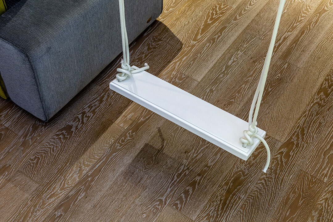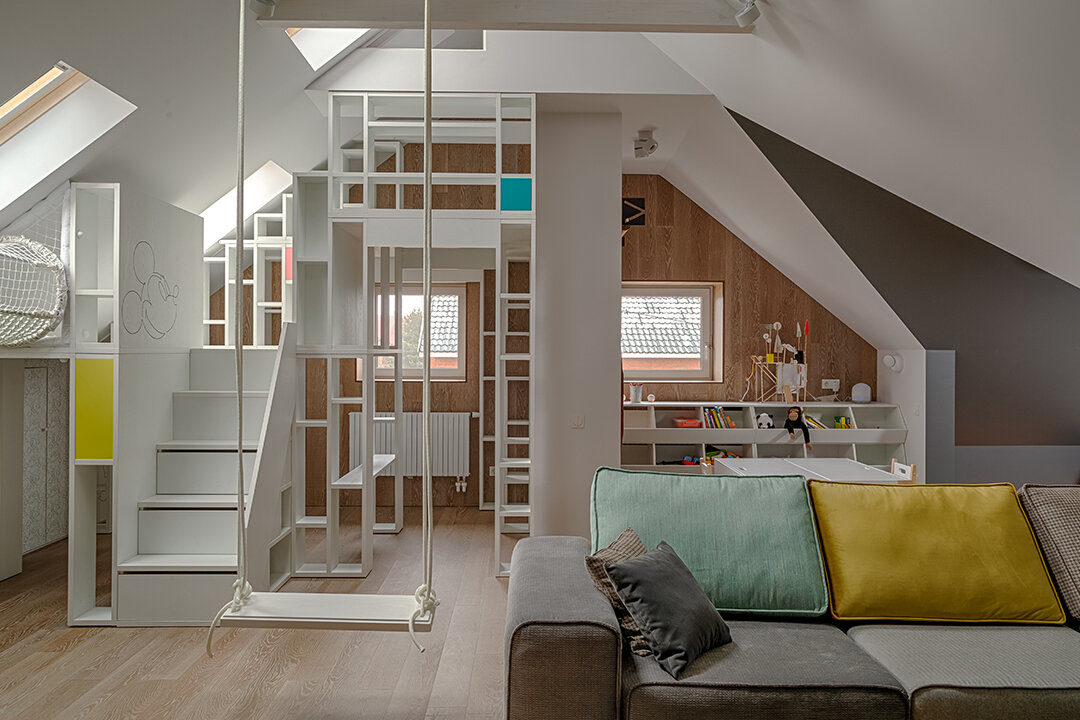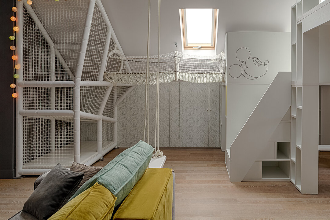 В мансарде сделали детскую комнату мечты. Домик для детей в несколько этажей возвели по проекту дочки героев и ее друзей. Для взрослых предусмотрели огромный диван, а отдыхать всей семьей можно в «пещере» на лежанке под скатами!