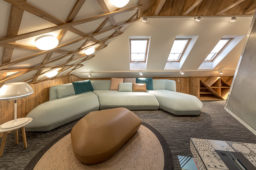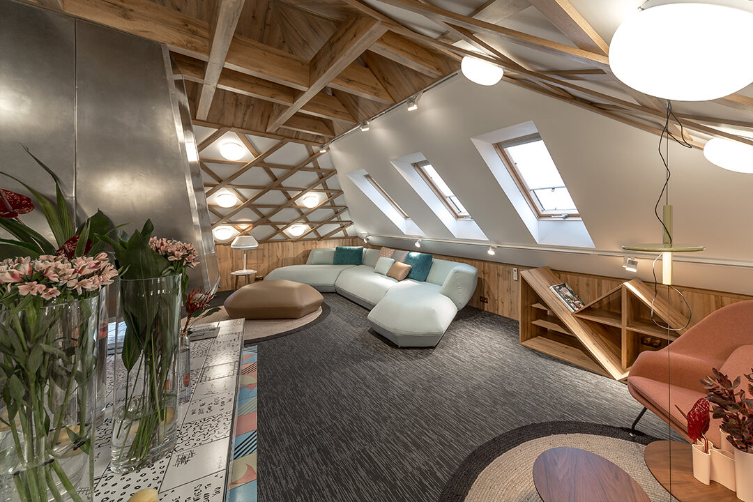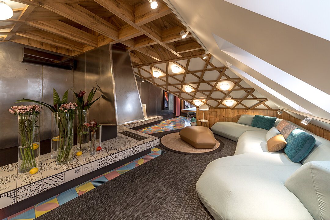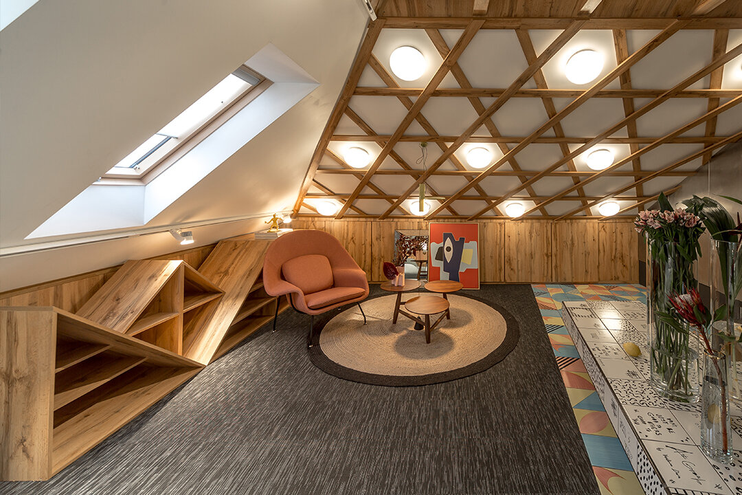 Наши герои – молодая пара, мечтали о личном пространстве и месте для романтического уединения. Поэтому прямо под крышей мы сделали мансарду для свиданий, где Кристина и Иван смогут вечерами сидеть у огня и разглядывать звёзды. «Создавая этот проект, я вдохновлялась Калифорнией 60−70−х гг. В обычную подмосковную мансарду хотелось привнести соответствующее солнечное настроение и дух свободы» — поделилась автор. На полу виниловый швейцарский пол. В его основе твердая водостойкая плита из ПВХ с замком — защелкой, так что собирается пол легко и быстро. Внешний слой плиток напоминает рогожку, которая усиливает разнообразие использованных в мансарде фактур. Виниловые нити многослойного композитного материала верхнего слоя плиток переплетены и склеены друг с другом, что повышает износостойкость покрытия, а также его влаго- и шумозащитные свойства.