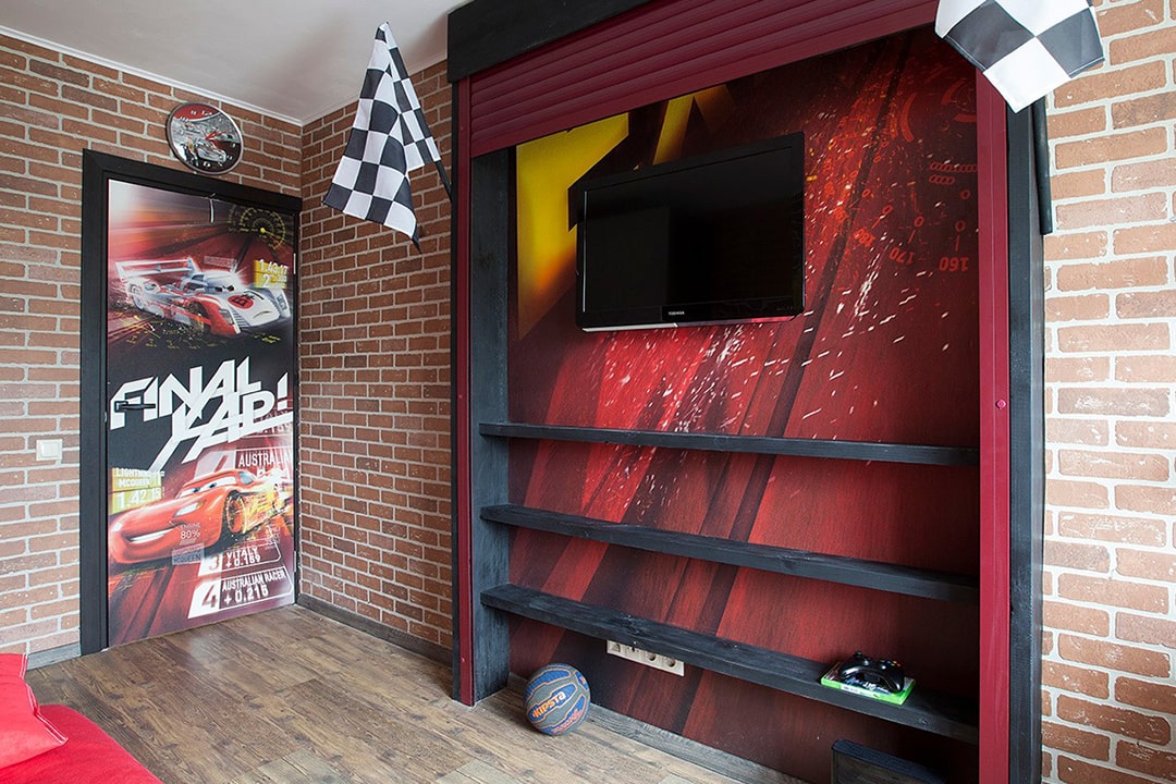 Эту комнату для Гриши сделали в стиле лофт – на такое решение дизайнера навели увлечения мальчика тачками и баскетболом. Уличная тематика отлично этому соответствует.