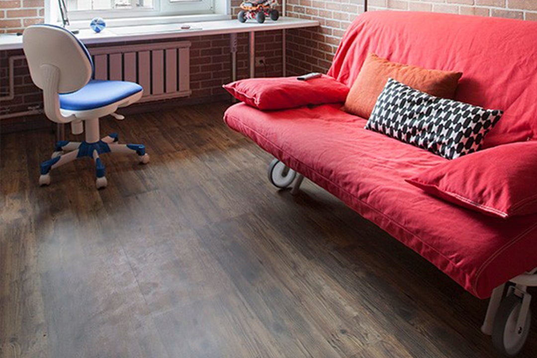 Потому здесь появилась темная кирпичная стена и темный пол. Только это не дерево и даже не ламинат. Это очень тёплая и практичная пробка с печатью. Дизайнер выбрал пол с изображением древесины тонированного дуба. Пол получился довольно брутальным, если такое определение подходит к напольному покрытию.
