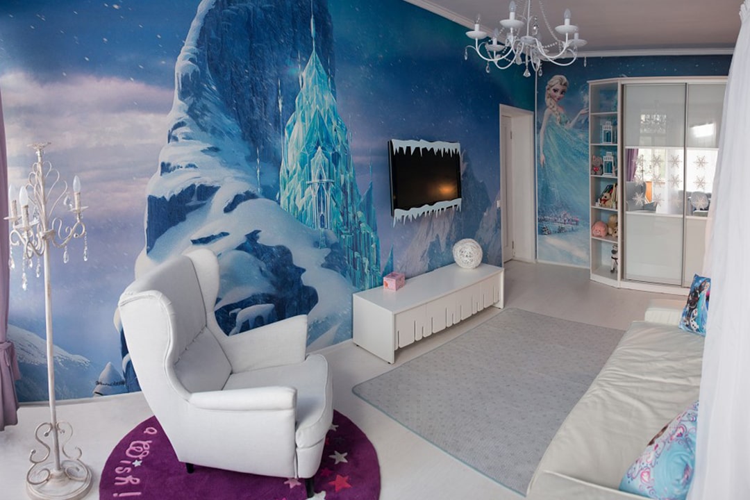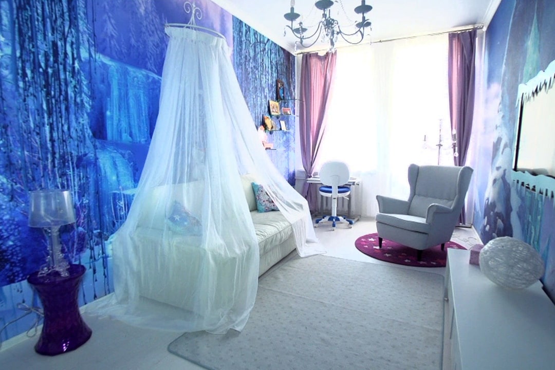 Хозяйка этой детской попросила создать ей в комнате настоящий ледяной замок, в котором будет уютно и тепло. Дизайнер предложил в отделке использовать оттенки синего6 голубого и фиолетового цветов, а фоном сделать, конечно, белый.
