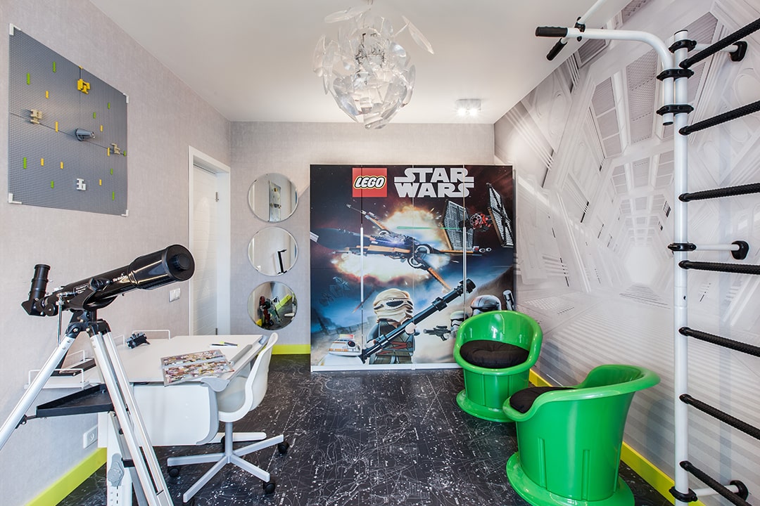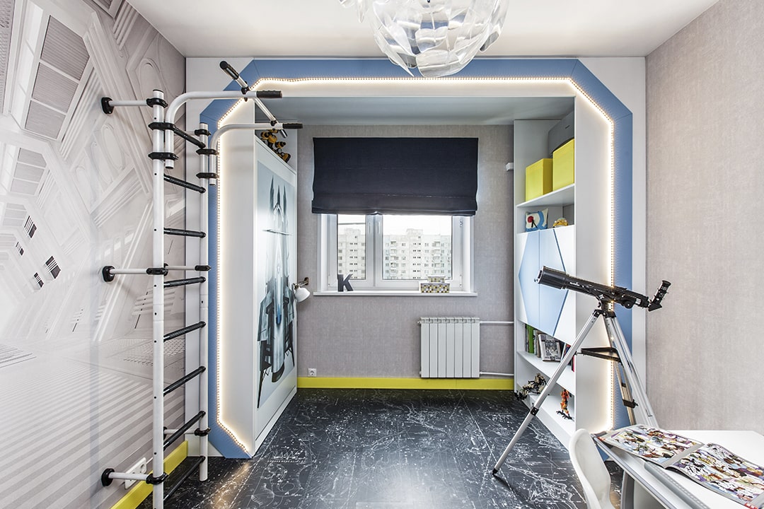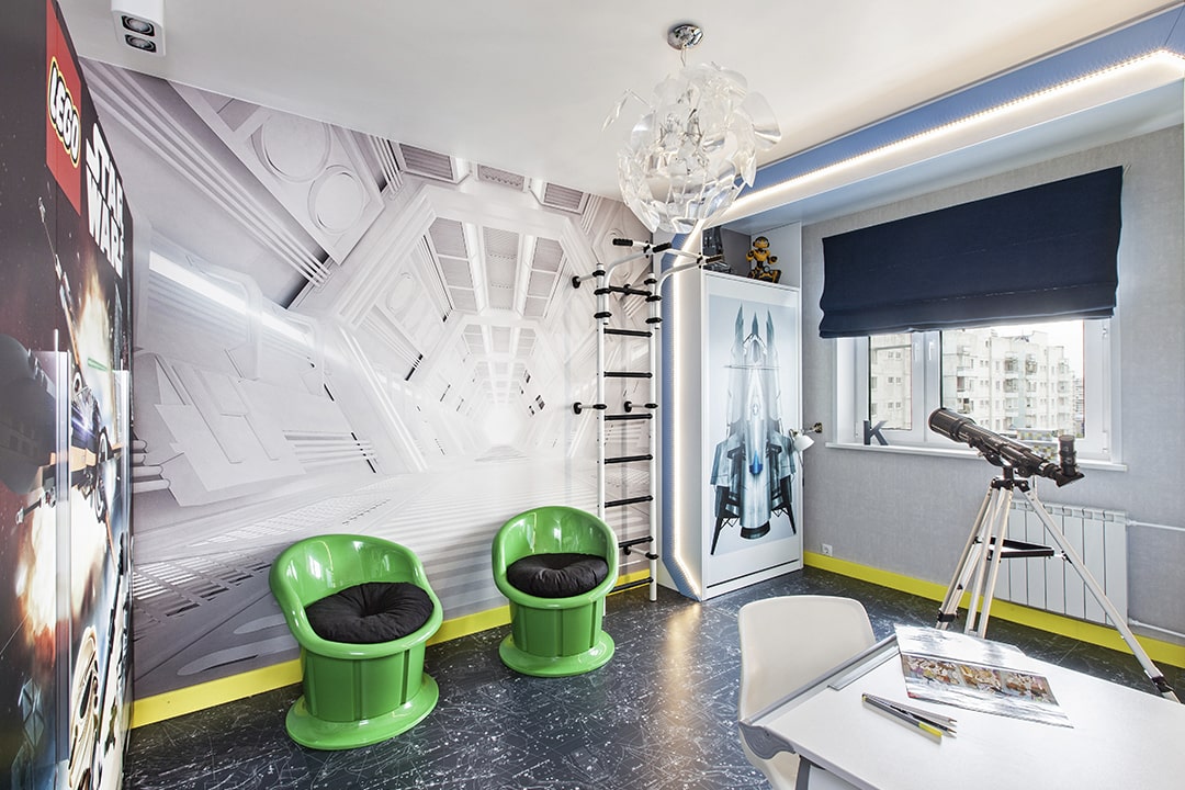 Дизайнер придумала сделать в комнату-космический корабль. Так, чтобы из иллюминаторов были видны звёзды, а созвездия можно было изучать, не вставая из-за парты. Потому и уложили здесь напольное покрытие с изображением млечного пути и карты звёздного неба.