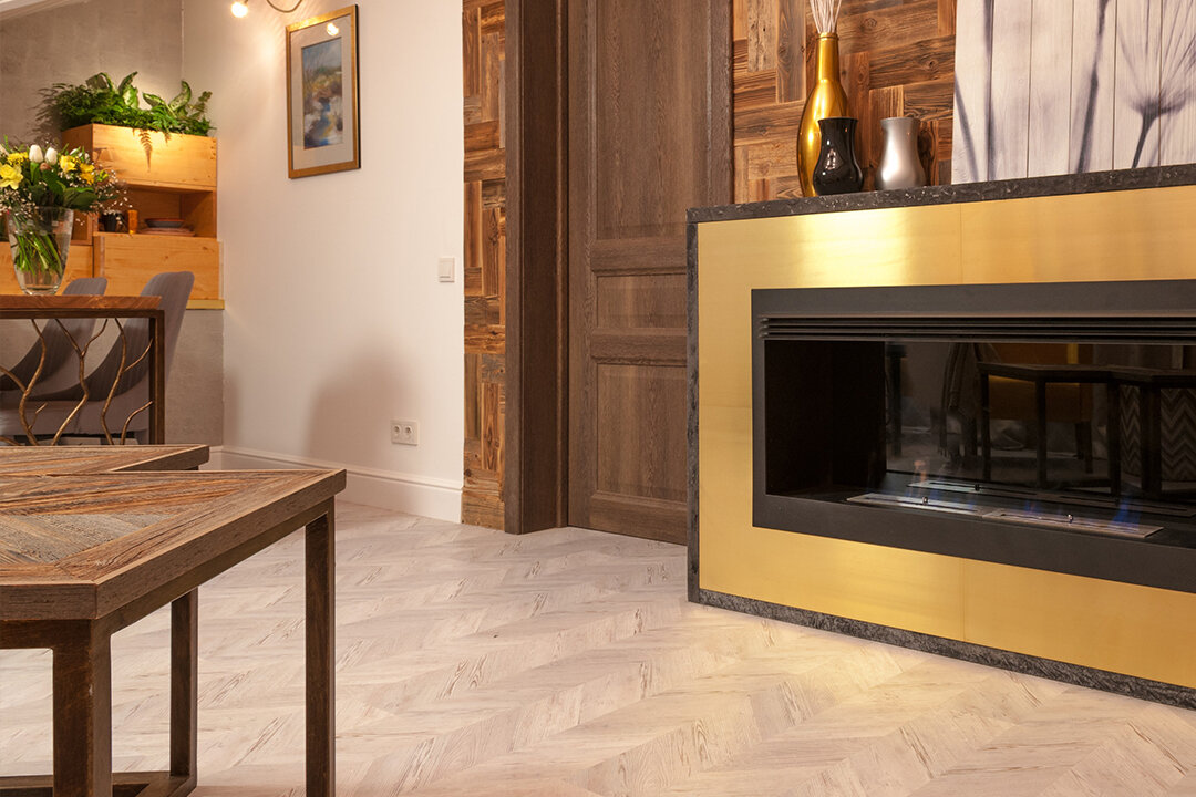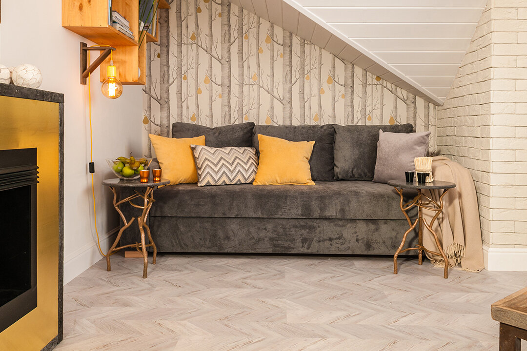 Дизайнер этого проекта хотела создать экологичный и при этом очень современный интерьер. Потому наряду с натуральным деревом в отделке здесь есть и дизайнерские обои с изображением деревьев, а с современными светильниками соседствует большая люстра с лесным принтом. Пробковый пол с изображением классической французской ёлочки объединяет все это своим оттенком и фактурой слегка состаренного дерева.