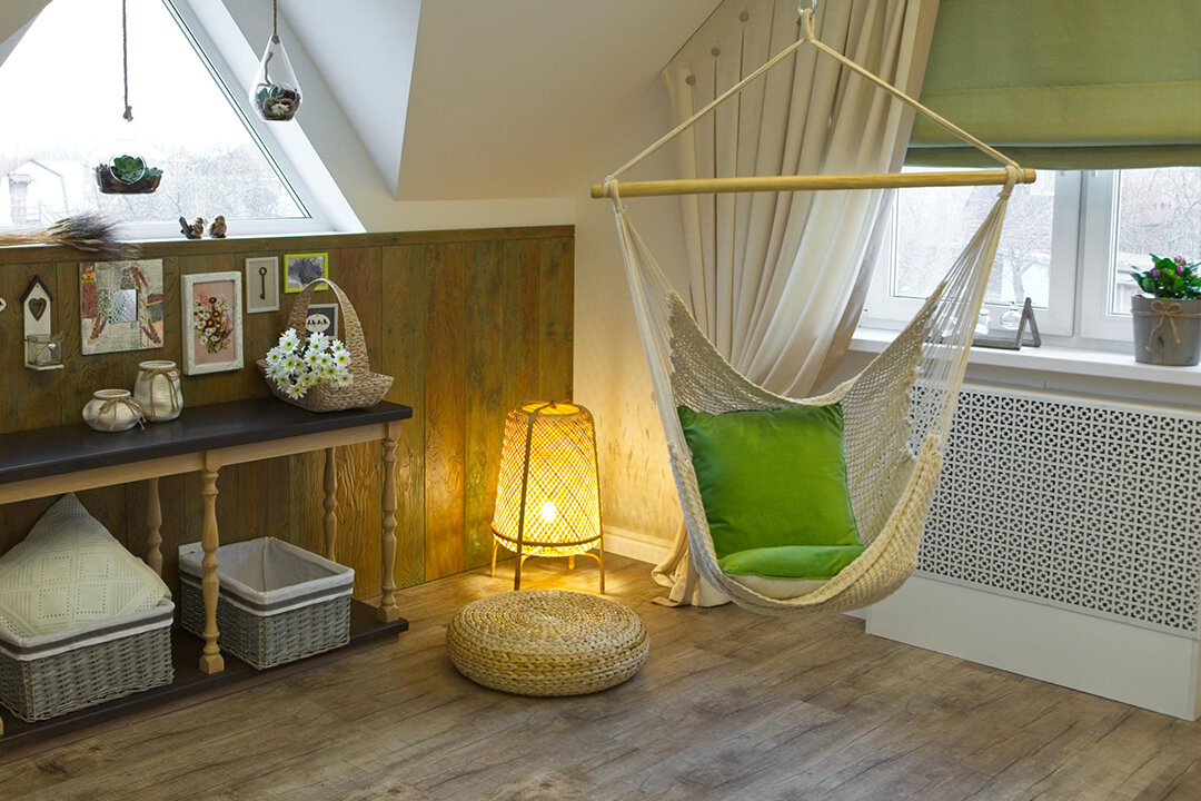Здесь вы видите отличный пример того, что получается, когда при оформлении интерьера дизайнер «пляшет» от пола. Обратите внимание, что абсолютно все оттенки, что есть на полу, присутствуют в других деталях интерьера.