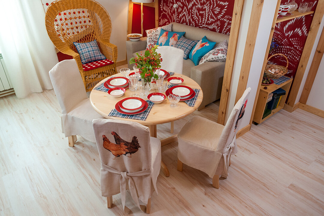 Когда вы делаете яркий интерьер, помните, что фон лучше сделать спокойным. На примере этой гостиной очень хорошо видно, что светлый пробковый пол визуально расширяет пространство. Потолки в доме довольно низкие, а светлые пол и потолок визуально немного приподнимают его и делают пространство легче.