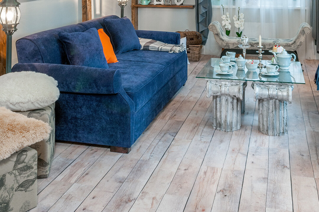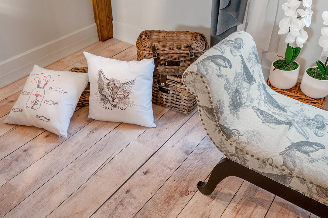 Состаренные доски на полу в этом проекте прекрасно сочетаются с предметами из натуральной лозы, светлыми предметами мебели и декором.