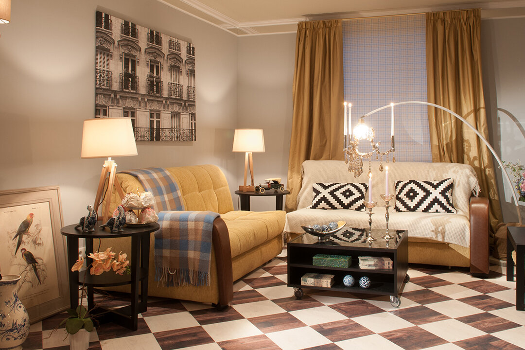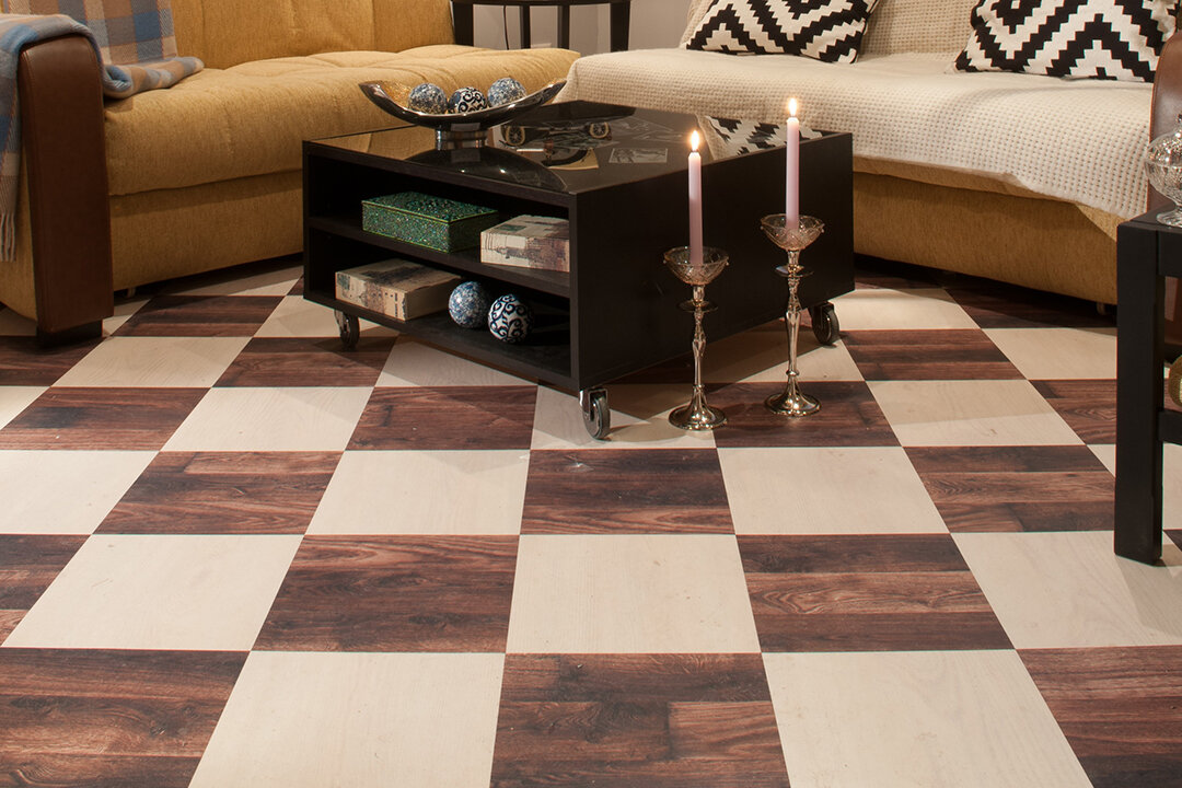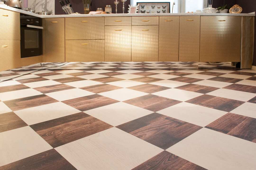 Для создания общего пространства и визуального увеличения площади решили везде уложить одинаковый пол. Деревянный пол на кухне было делать непрактично, а укладывать плитку в гостиной – холодно и неуютно. Потому дизайнер и выбрала единственное возможное решение – уложить везде клеевую пробку с прямой печатью. Диагональная укладка и вправду делает помещение визуально больше.