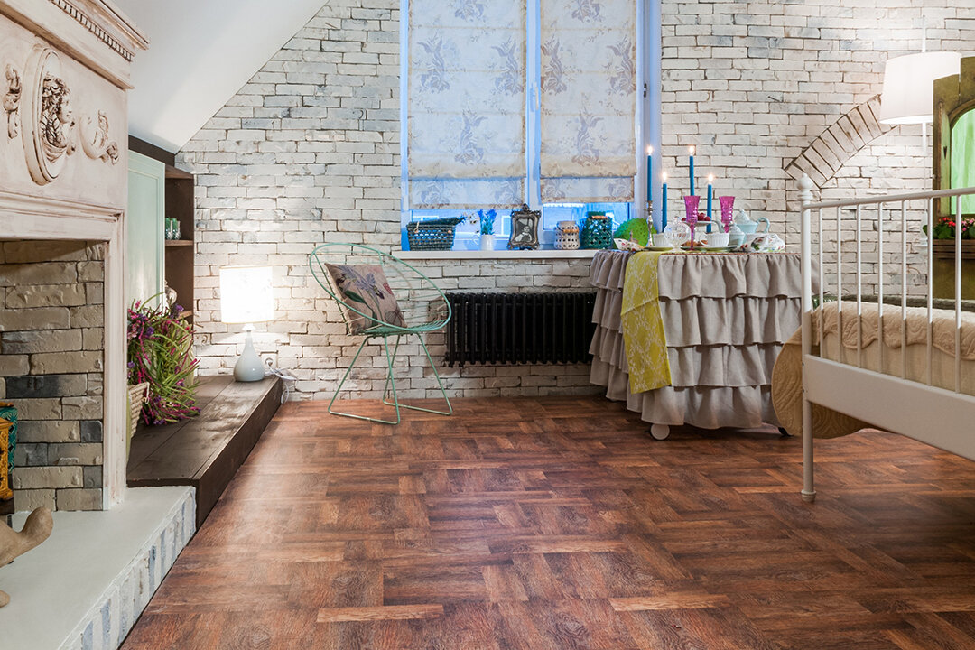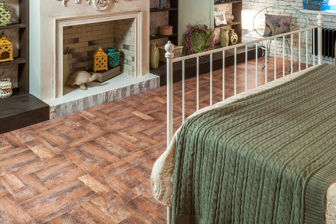 Наборный паркет – это всегда очень изысканно, но трудоёмко и дорого. Поэтому для этой спальни дизайнер выбрала пробковый пол с изображением наборного паркета. Это замковый пол, укладывать его так же просто, как паркетную доску или ламинат, а выглядит он как настоящий паркет.