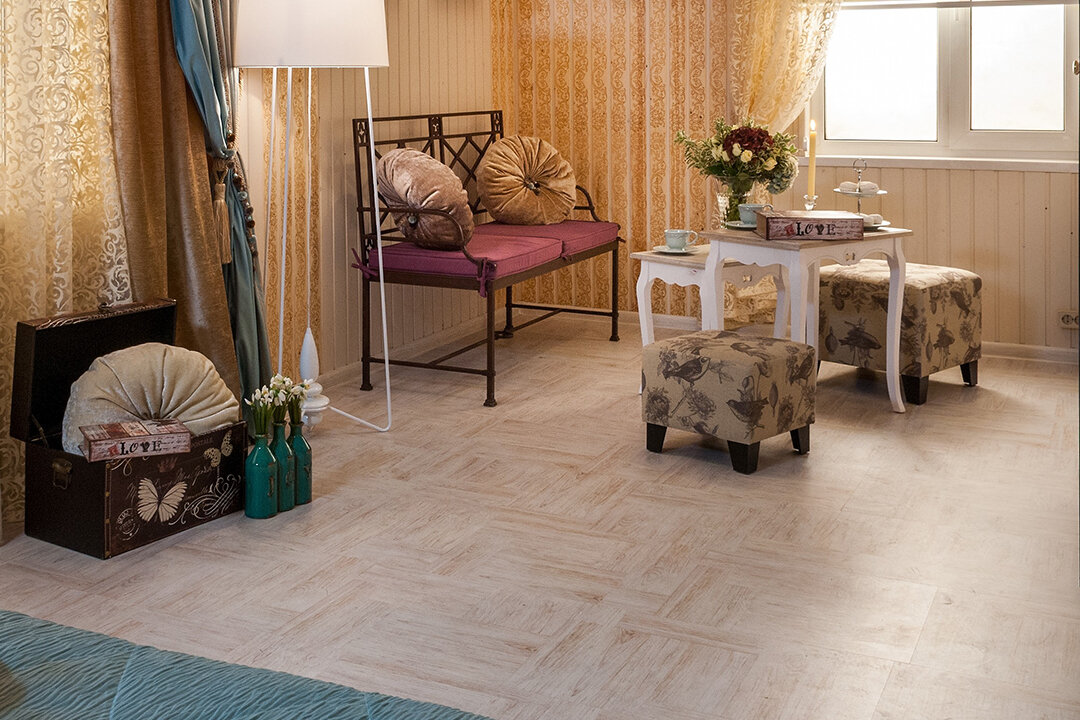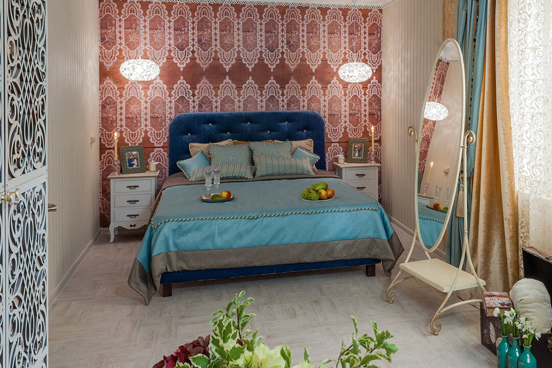 Особенностью отделки этой спальни стало множество деталей с кружевным рисунком – это и арт-вагонка, и деревянные резные панели, и шторы, и обои с изображением кружева в изголовье кровати. Уравновесить эту отделку нужно было светлыми цветами интерьера и полом в классическом стиле.
