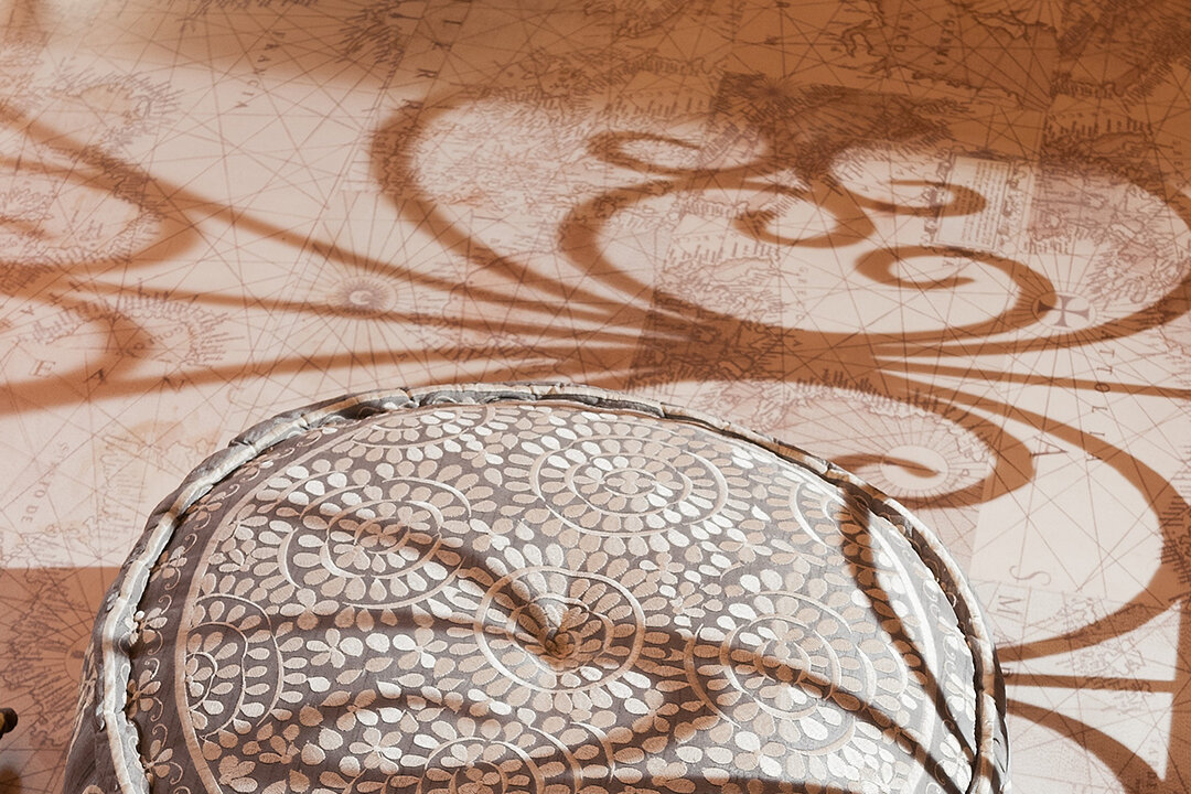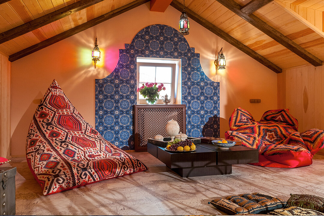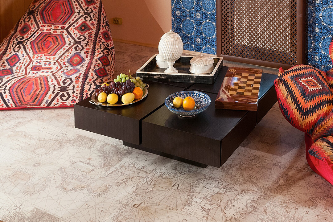 В сочетании с отделкой в восточном стиле, с удобными креслами мешками и с низкими столиками карта мира на полу очень располагает к отдыху и мечтам о новых путешествиях. Здесь можно собираться, вернувшись из очередного путешествия, чтобы обсудить впечатления и наметить новые маршруты.