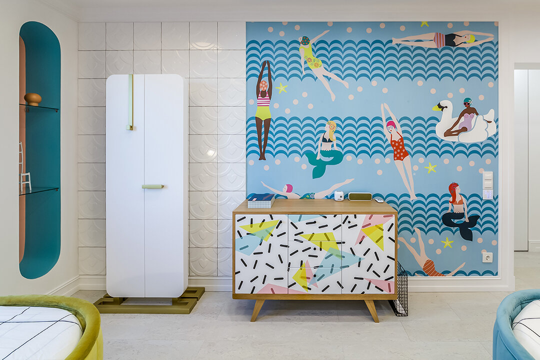 Интерьер получился динамичным, гармонично объединив обилие ярких предметов и различных текстур в единый незаурядный стиль.