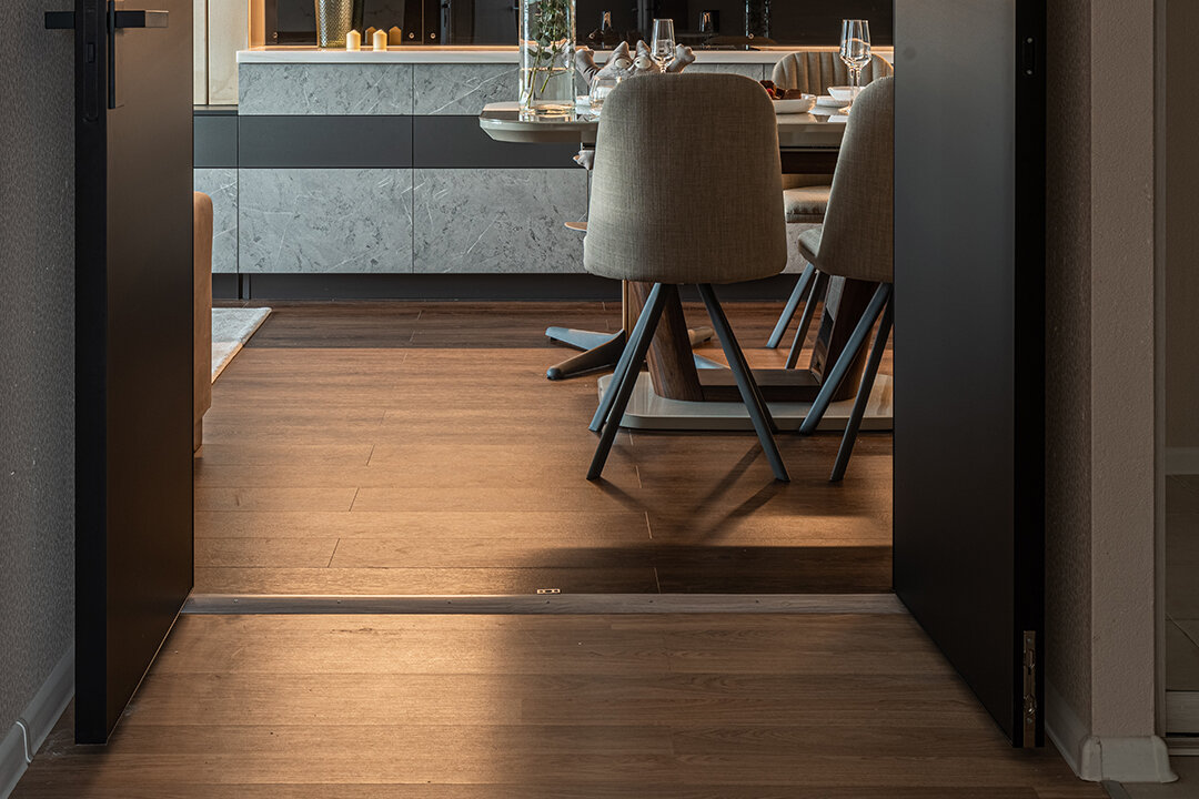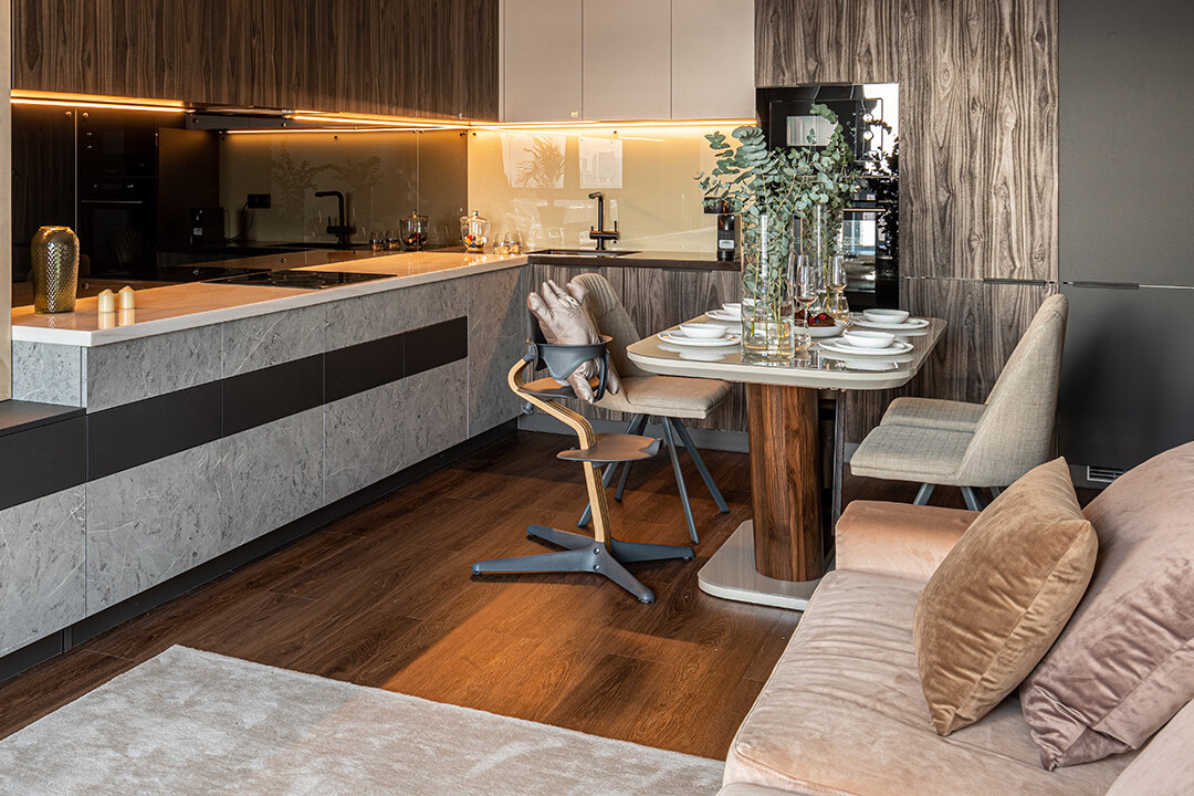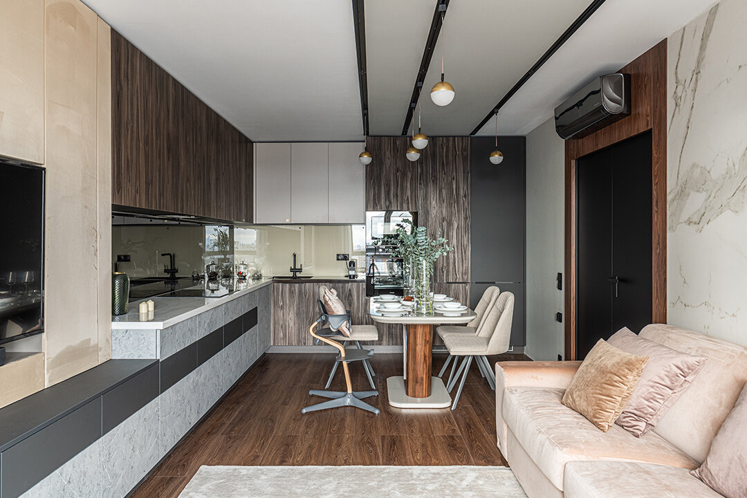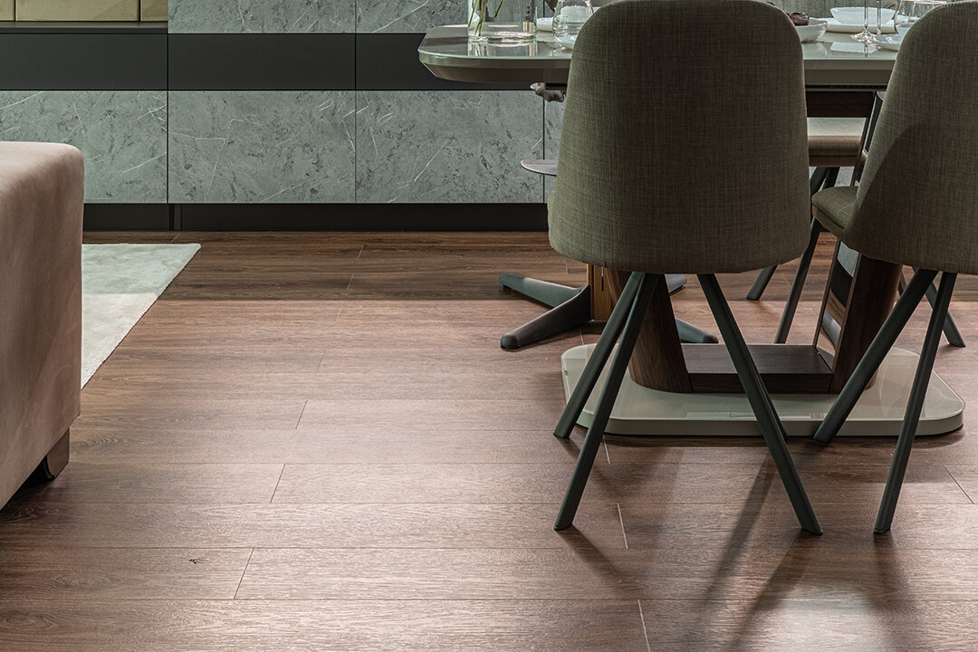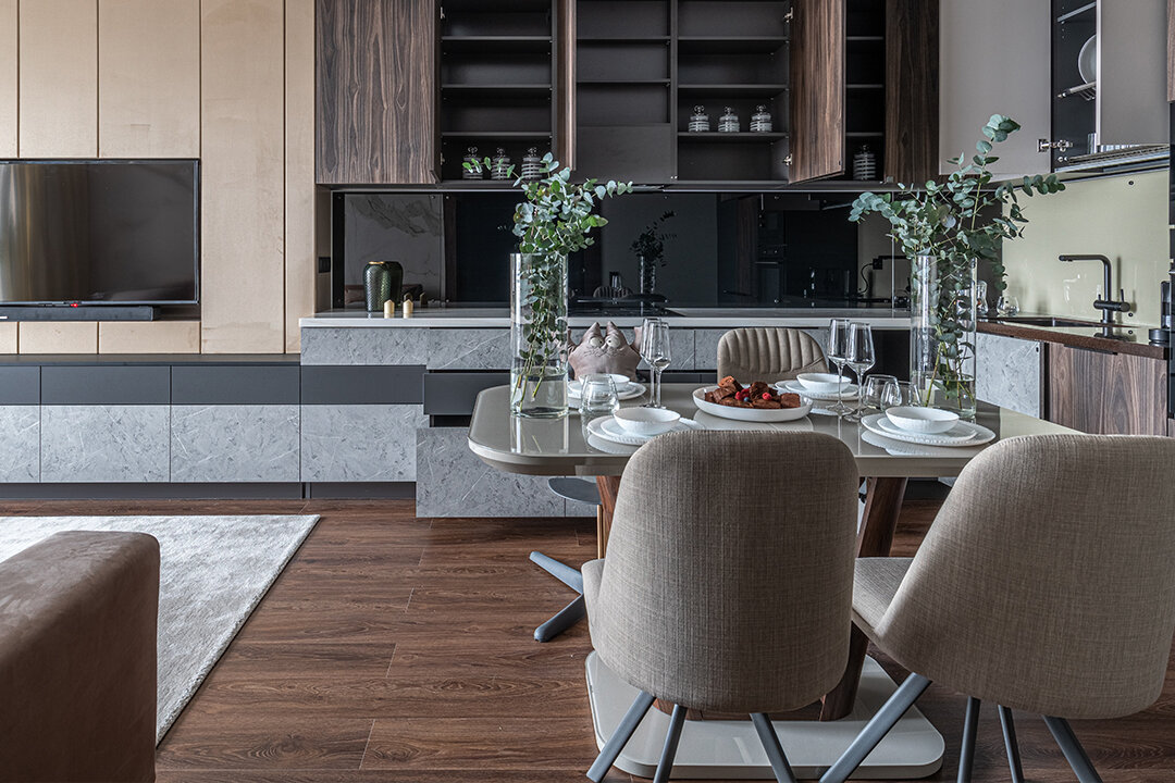 Кухня-гостиная с легкой руки дизайнера Татьяны Кононовой стала комфортной и уютной. Теперь герои могут в этой зоне одновременно расслабляться, отдыхать и даже принимать гостей. Для пола кварц-виниловый ламинат выбран не случайно: он абсолютно водостойкий и износостойкий. Рисунок покрытия живо передает текстуру дерева – и на глаз, и на ощупь такой пол словно собран из настоящих досок.