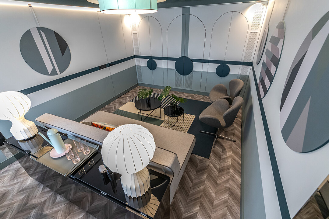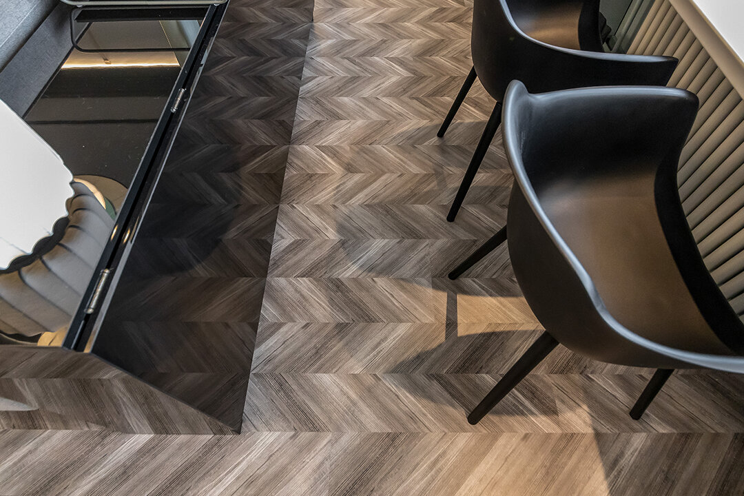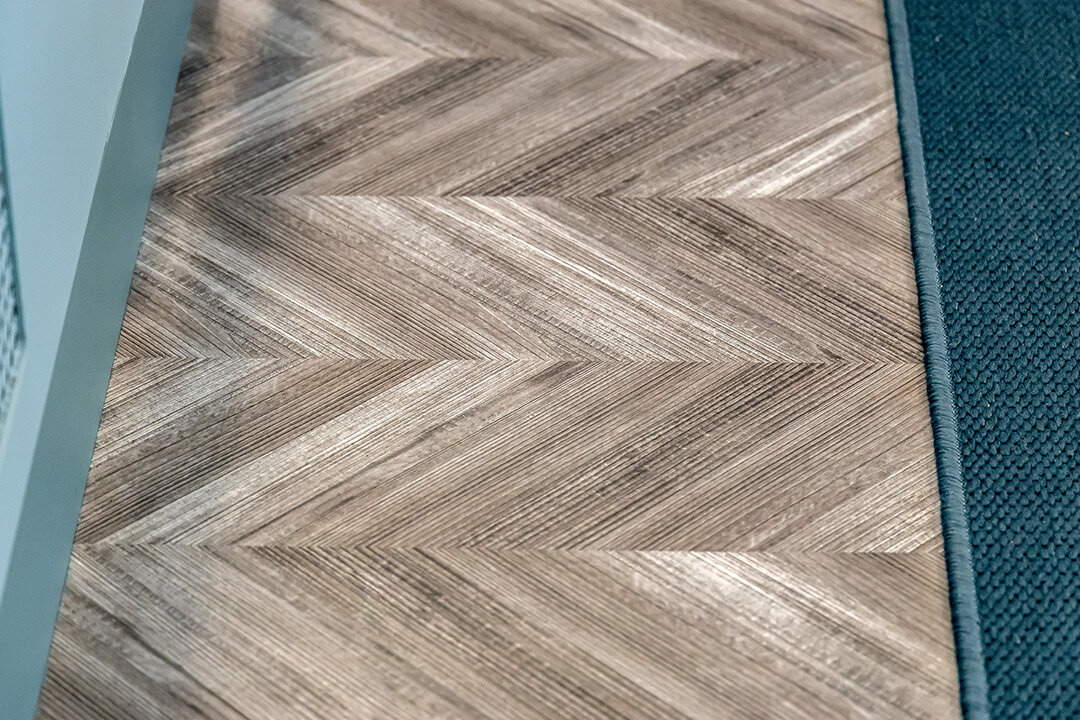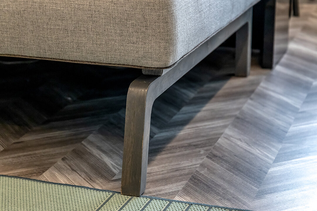 Округлые формы сочетались с геометрией прямых линий. Пробковый пол Chevron внес свой вклад и серым цветом и рисунком в виде елочки.