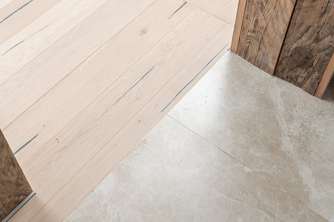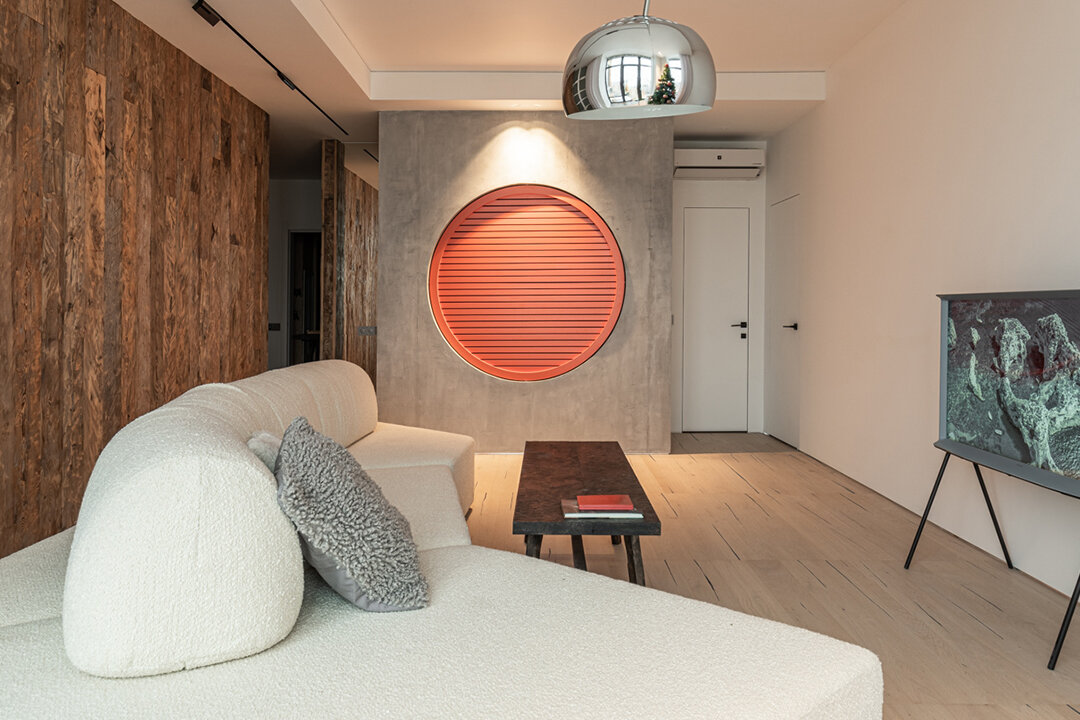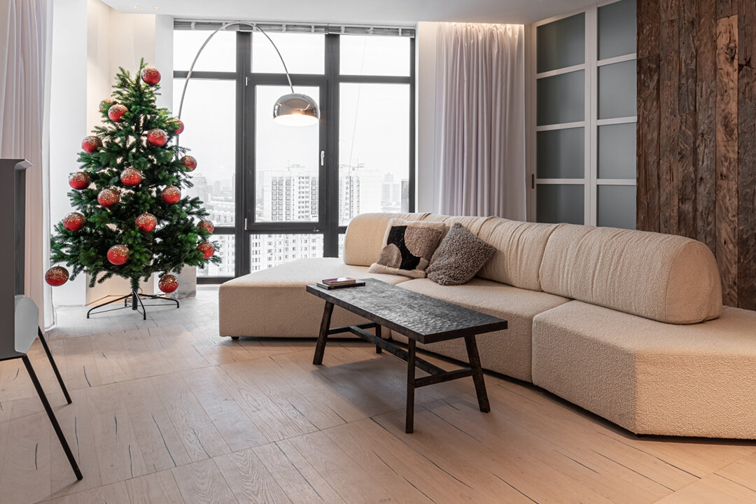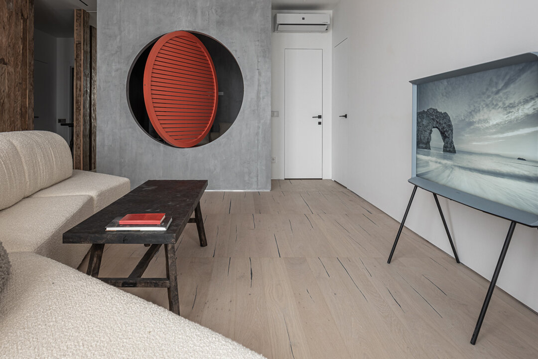В качестве финишного покрытия для гостиной, архитектор Сергей Аладашвили выбрал паркетную доску. Она из Испании. Ее основная особенность в высокой прочности и износостойкости. В основе — древесно-волокнистая плита, сверху шпон натуральной древесины покрытый 8-ю слоями лака!