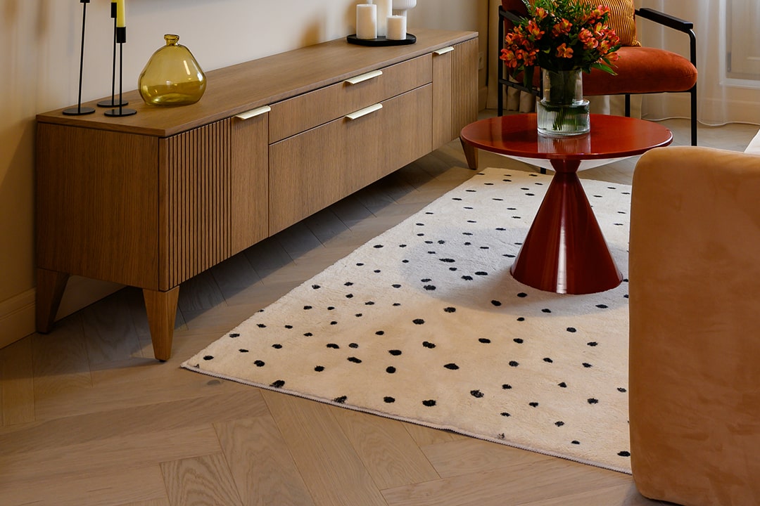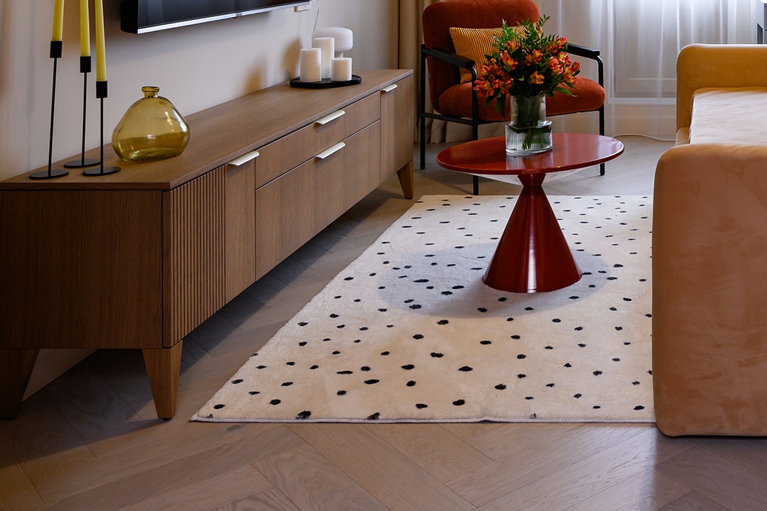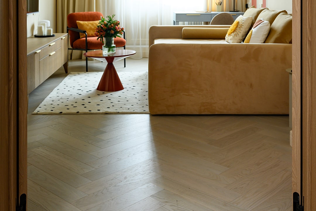 В этой квартире паркетная доска Auswood, коллекция «Herringbone», оттенок натуральный дуб сканди Elba Oak— основа всего интерьера. Светлый, словно первый солнечный луч, он наполняет пространство воздухом, тёплой гармонией и чувством завершённости.