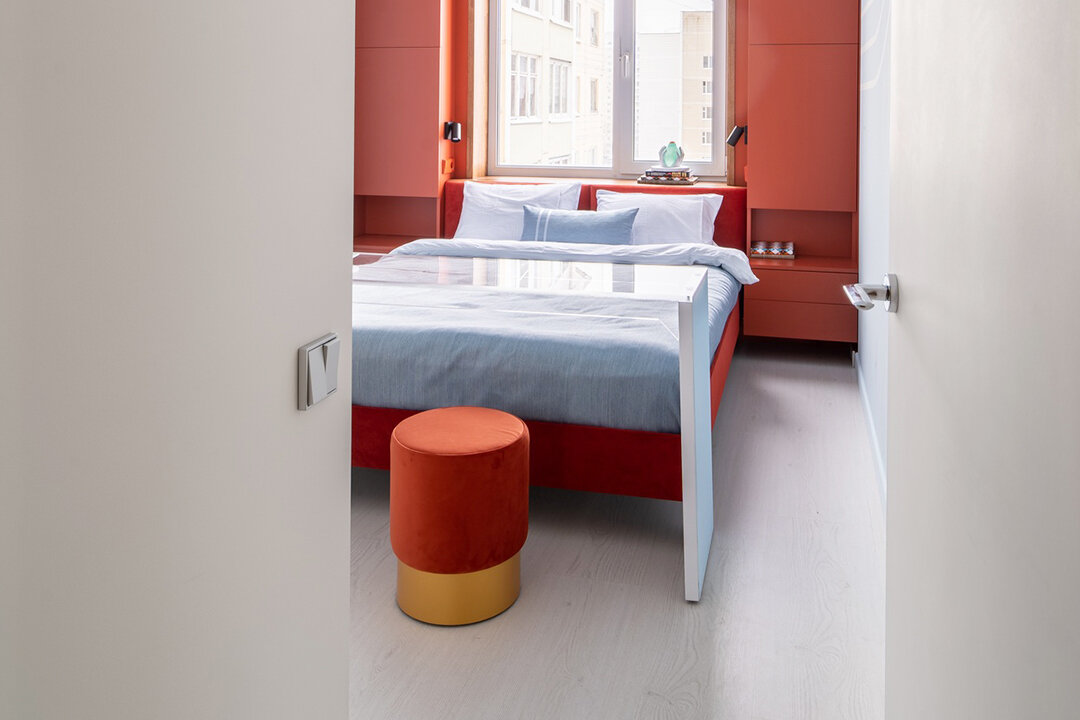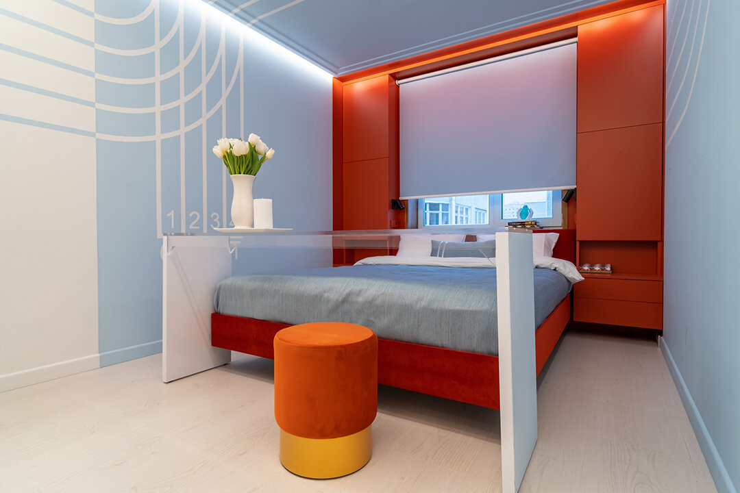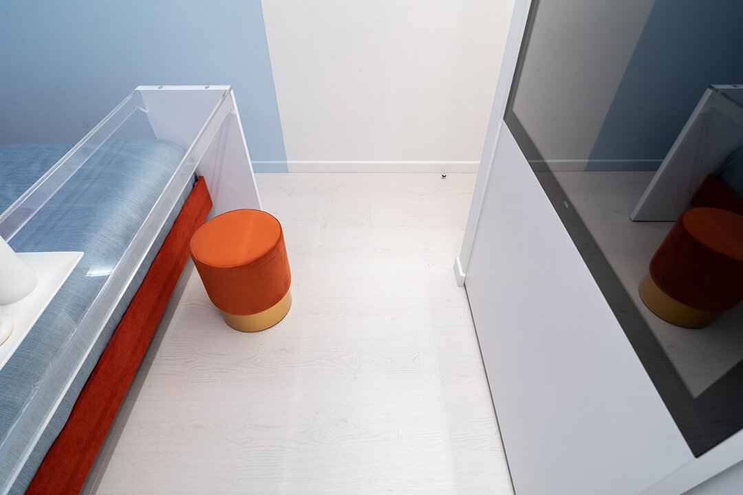 Лейтмотивом этого проекта стали здоровый образ жизни. А источниками вдохновения — конструктивизм. Спальня получилась сбалансированной и уютной. С одной стороны яркие элементы дизайны, а с другой белоснежный пол — идеально подчеркнул и сбалансировал. Не стоит бояться белого пробкового напольного покрытия — в данном случае это фотопечать древесины защищена сверхстойким лаком, поэтому у покрытия 33 класс износостойкости.