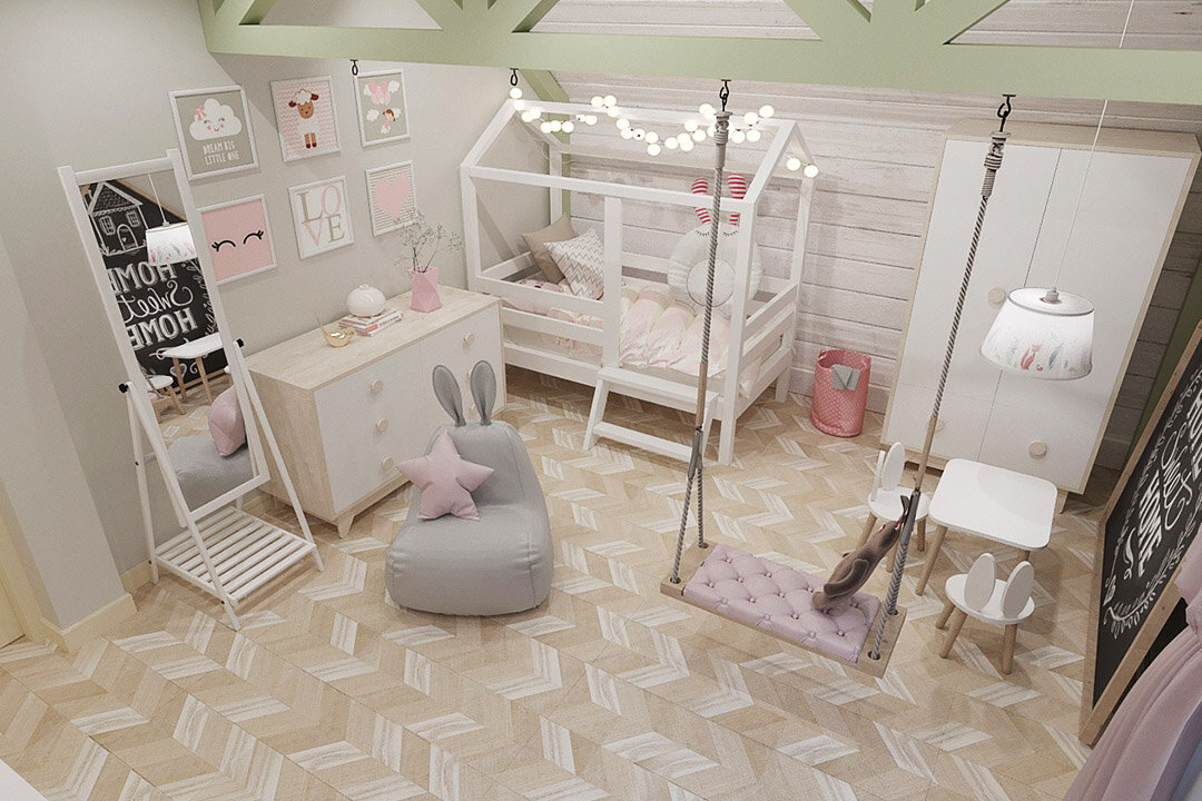 Детская для девочки 3х лет. Одна из стен оформлена обоями с цветочным принтом, стена напротив - имитацией бруса, который тонирован в белый цвет, остальные стены окрашены в серый почти белый цвет. Потолок оформлен декоративными балками. На центральной балке монтированы несколько крюков для веревочной качели, расположение которой можно менять.