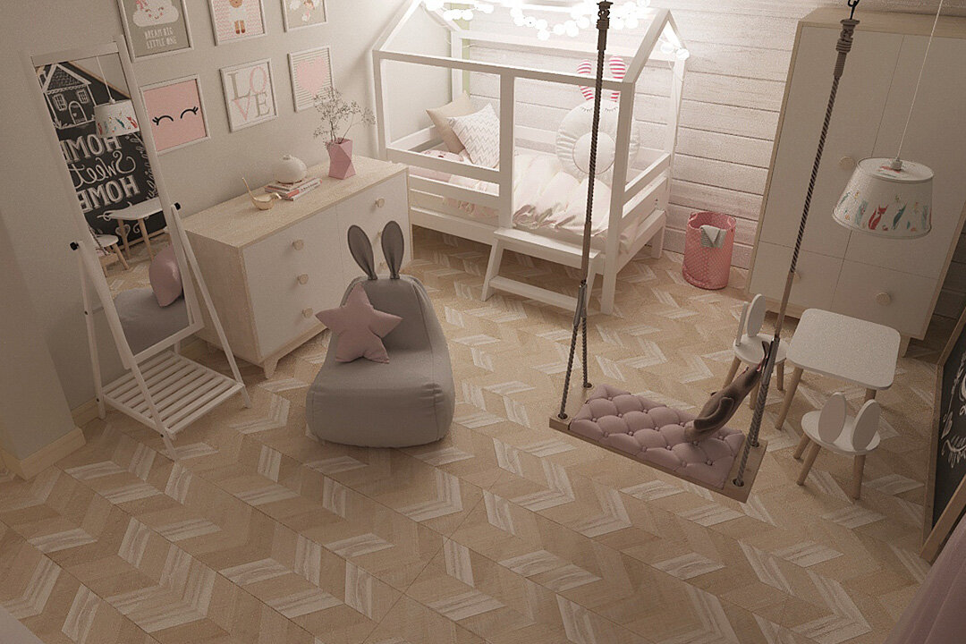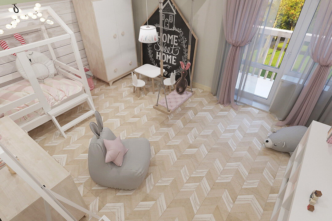 На полу - пробковое покрытие с фотопечатью Corkstyle нежного бежевого оттенка в стиле «французкой елочки». В комнате есть шкаф для одежды и комод, место для хранения игрушек, творческий уголок - стол для рисования и меловая доска. Интерьер получился очень нежным, за счет текстиля, декора и цветового оформления.