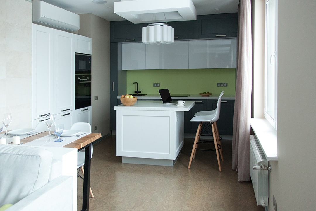 Квартира площадью 115 метров квадратных в современном стиле со множеством дизайнерских разработок мебели. По всей жилой площади (коридор, столовая, гостиная и детская комната) уложен клеевой пробковый пол единым контуром. Благодаря отсутствию порожков, поверхность смотрится монолитно и намного эстетичнее. За таким полом не перерезанным порожками между помещениями легко ухаживать, взгляд скользит ни за что не цепляясь.