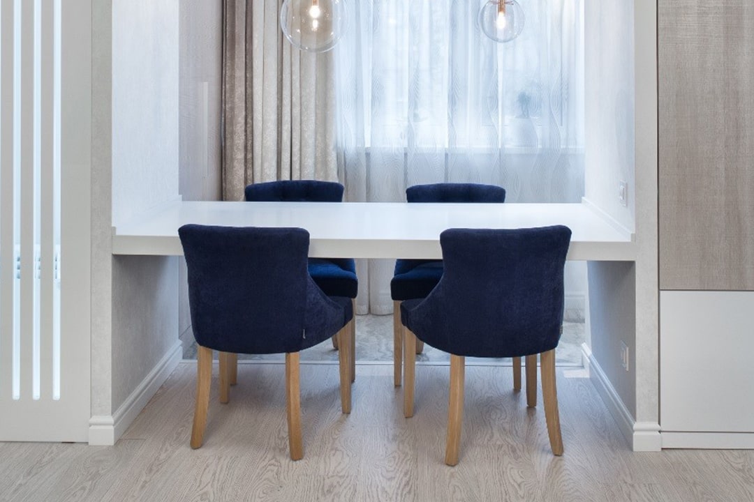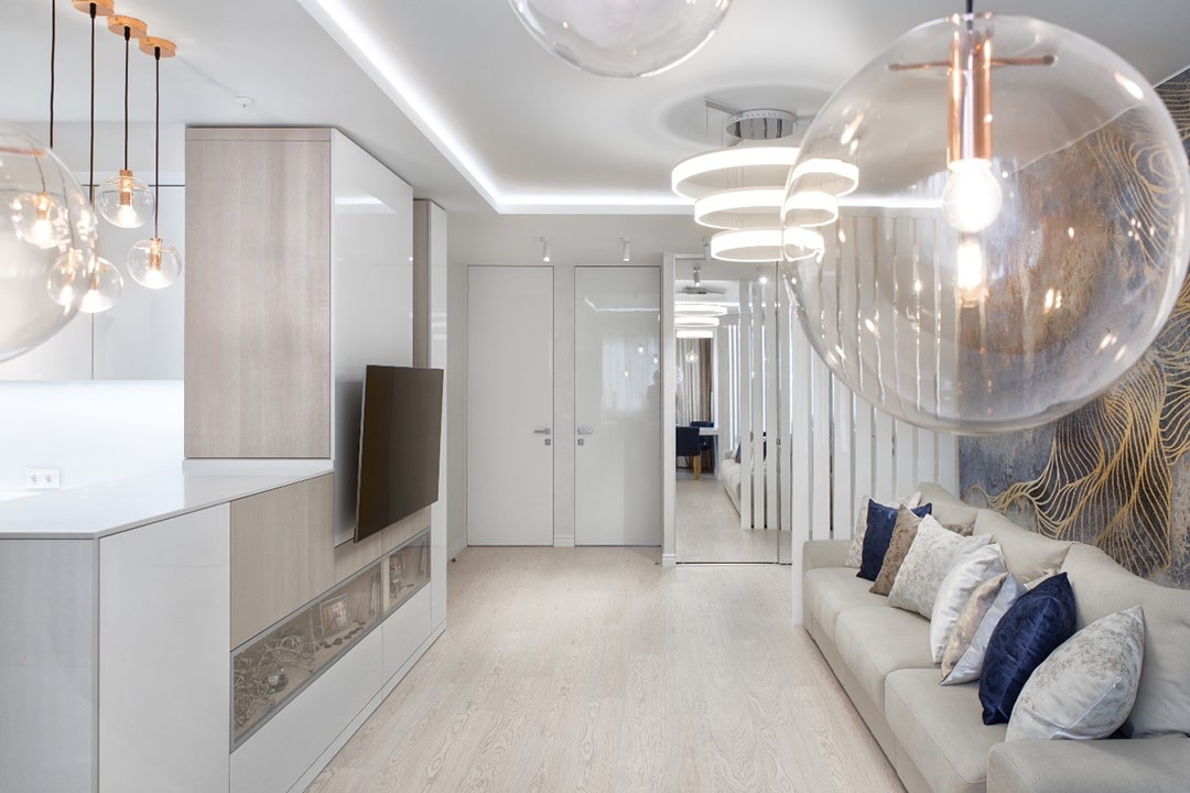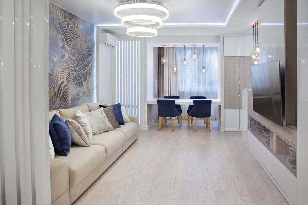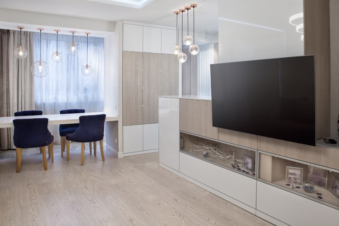 Изначально хозяева квартиры рассматривали дизайн интерьера под классику в современном исполнении. В вопросах цветовых предпочтений ориентировались на светло-бежевые, серые тона с яркими акцентами. Одним из таких акцентных фаворитов стал сиреневый и в ходе ремонта, симпатия сместилась в сторону синей цветовой гаммы. Основной мотив в интерьере кухни-гостиной отражен в названии проекта, именно «вертикали» стали основными линиями пространства. Они не только обеспечили ритм, но и зрительно увеличили высоту потолка.
