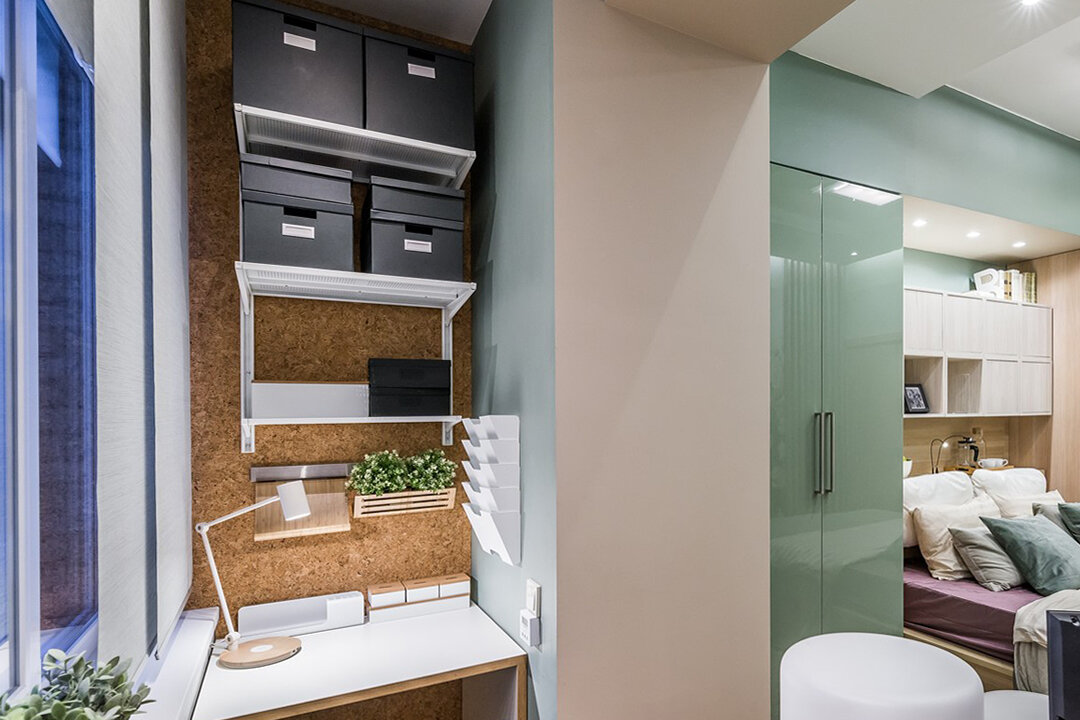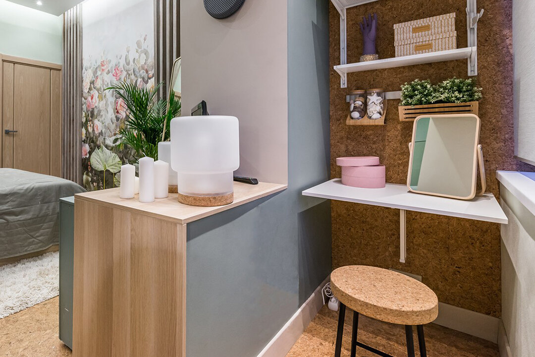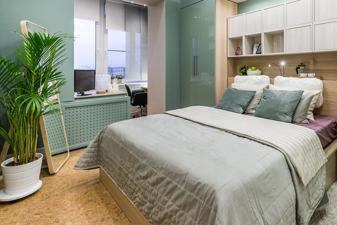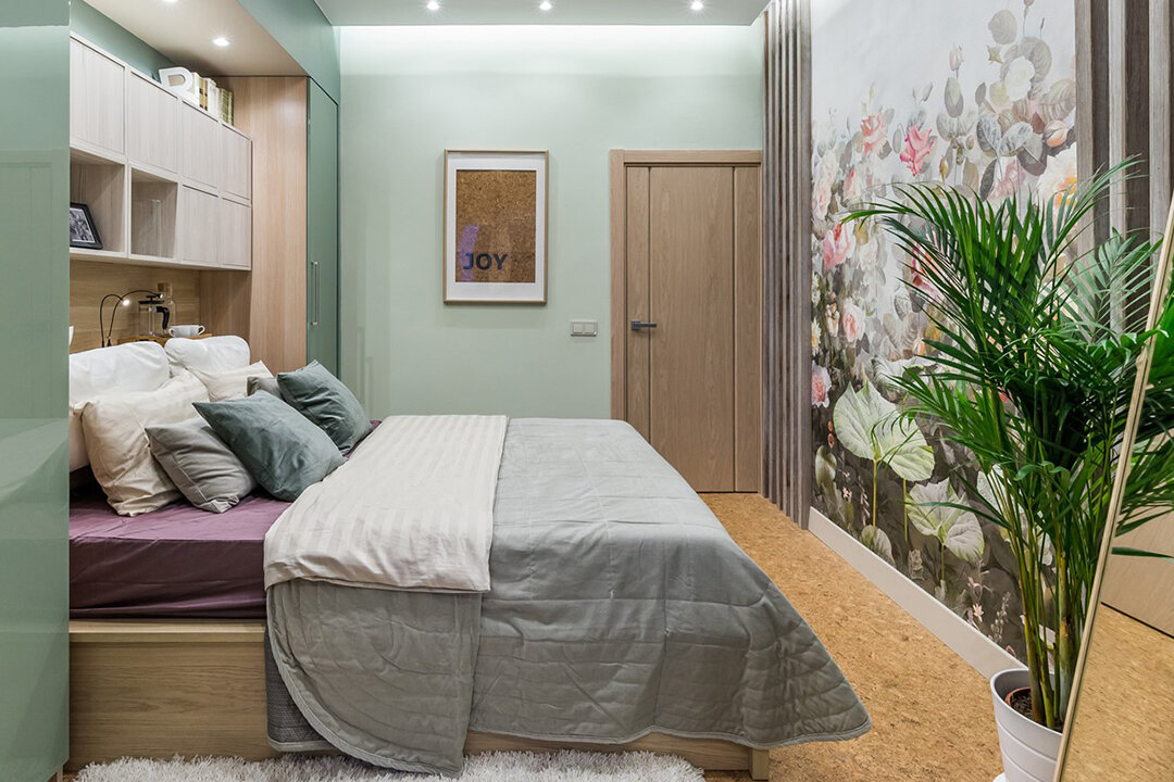 Дизайнер решила сделать спальню, в которой будет очень комфортно отдыхать от городской суеты, поэтому в отделке использованы материалы природных оттенков. Основной цвет интерьера – нежно-зелёный. Потому к нему в компаньоны Светлана выбрала пробковый пол с натуральным шпоном.