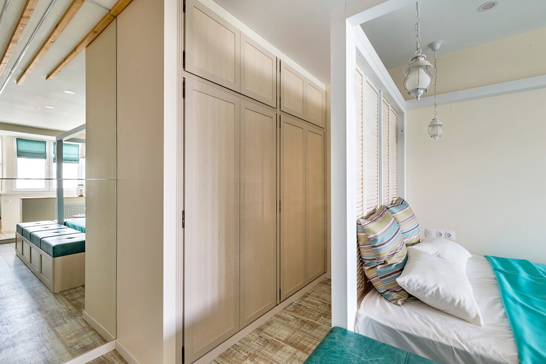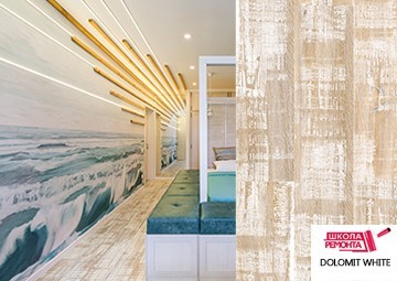 На самом же деле это тёплый и тихий пробковый пол, на который нанесено изображение таких старых крашеных досок методом прямой печати. Сверху рисунок надежно защищен лаком горячего нанесения, что делает покрытие очень износостойким. Оттенок пробкового пола помогает создать эту приятную атмосферу морского побережья. А свойства пробки делают его незаменимым в спальне. По такому полу комфортно ходить босиком в любое время года.