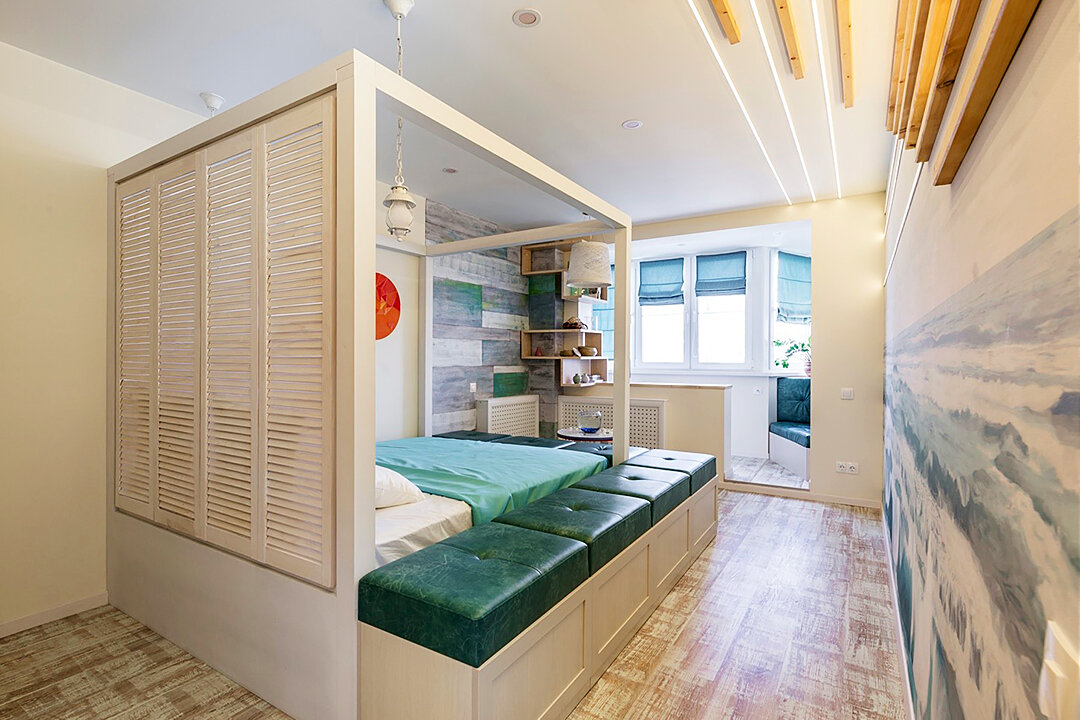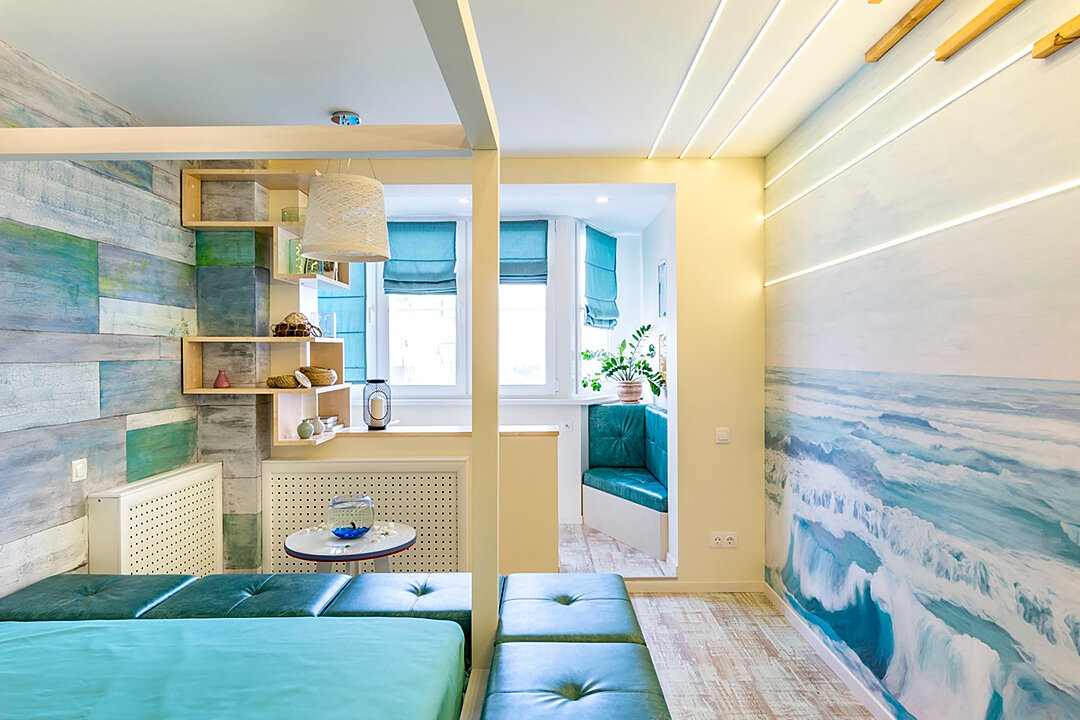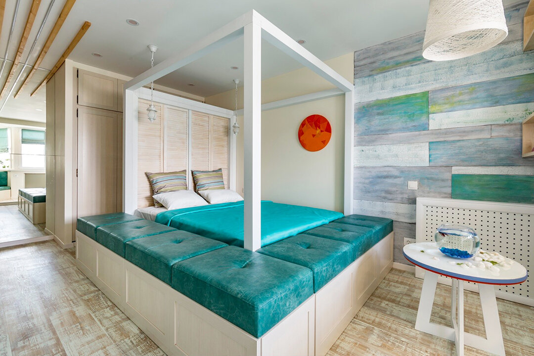В этой спальне чувствуется дуновение морского бриза и тепло нагретого солнцем песка на пляже. Интерьеры в морском стиле бывают очень разными. Этот привлекателен своей концепцией – кровать выглядит островом в океане. Закатное солнце, волны прозрачной воды, прохлада бриза – эта атмосфера создана отделочными материалами, использованными в проекте.