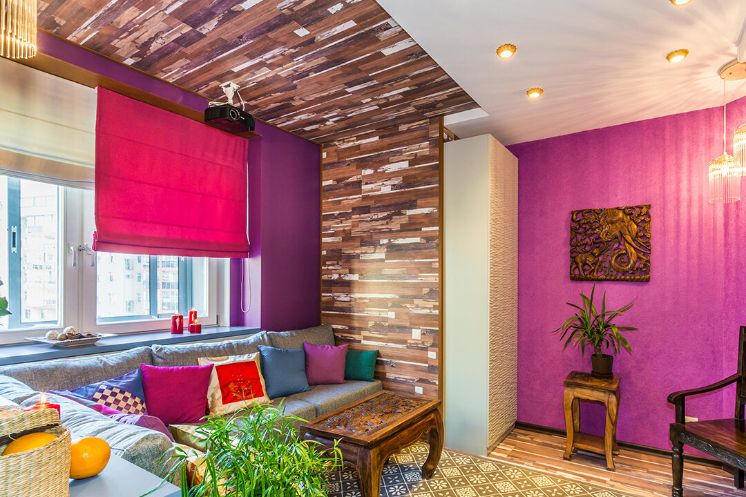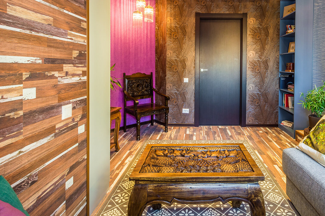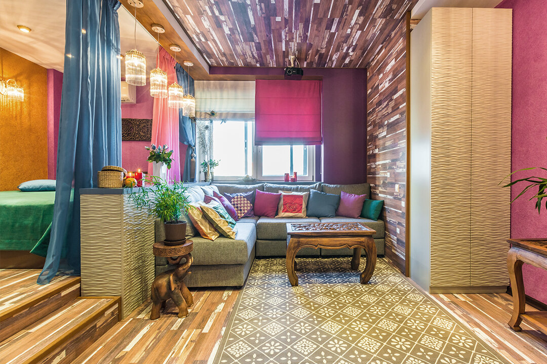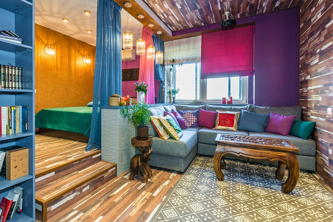 Хозяйка этого интерьера – поклонница индийской культуры, потому дизайнер решила привнести в него элементы индийского стиля. Комнату разделили на несколько функциональных зон.