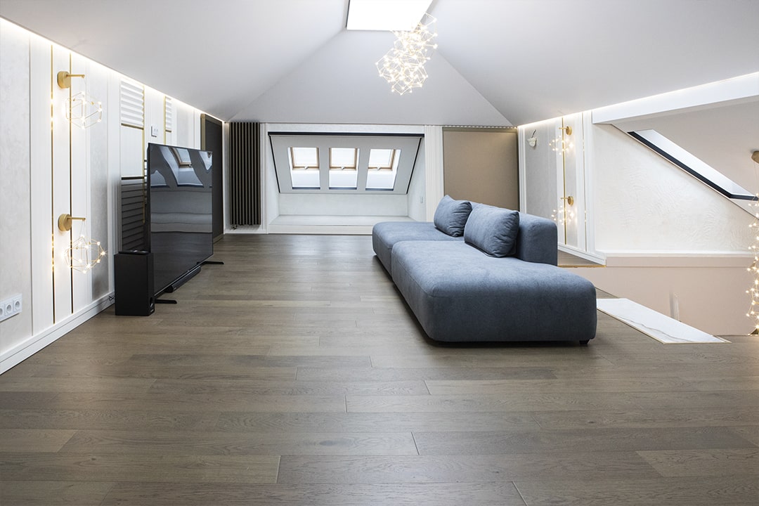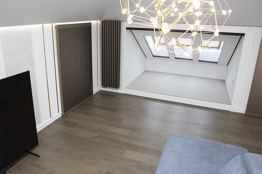 Чтобы пространство мансарды можно было эффективно эксплуатировать, материалы в отделке выбраны не просто дорогие, а еще и функциональные. Каждый элемент удобен для использования, обслуживания и уборки: лаконичные настенные панели, которые легко моются, парящие светильники с быстрым доступом, минимум декоративных элементов.