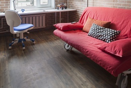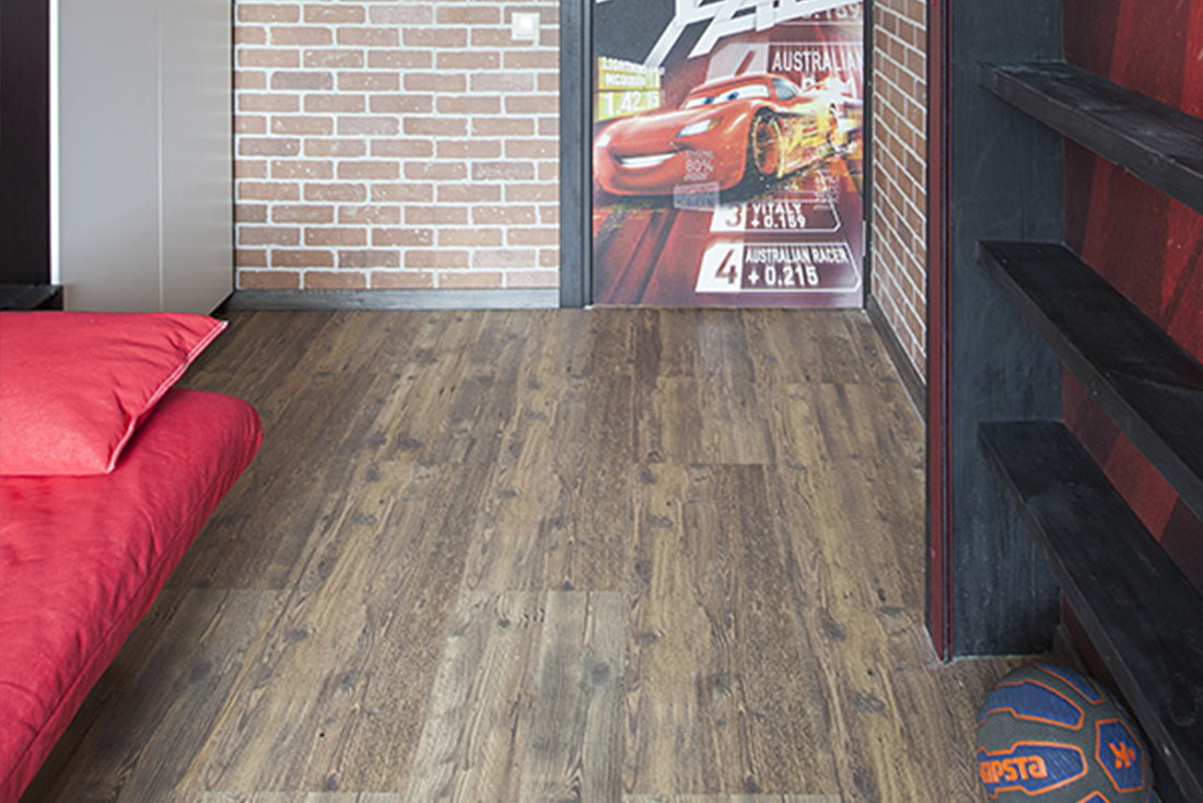 Потому здесь появилась темная кирпичная стена и темный пол. Только это не дерево и даже не ламинат. Это очень тёплая и практичная пробка с печатью. Дизайнер выбрал пол с изображением древесины тонированного дуба. Пол получился довольно брутальным, если такое определение подходит к напольному покрытию.