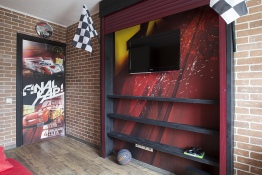Эту комнату для Гриши сделали в стиле лофт – на такое решение дизайнера навели увлечения мальчика тачками и баскетболом. Уличная тематика отлично этому соответствует.